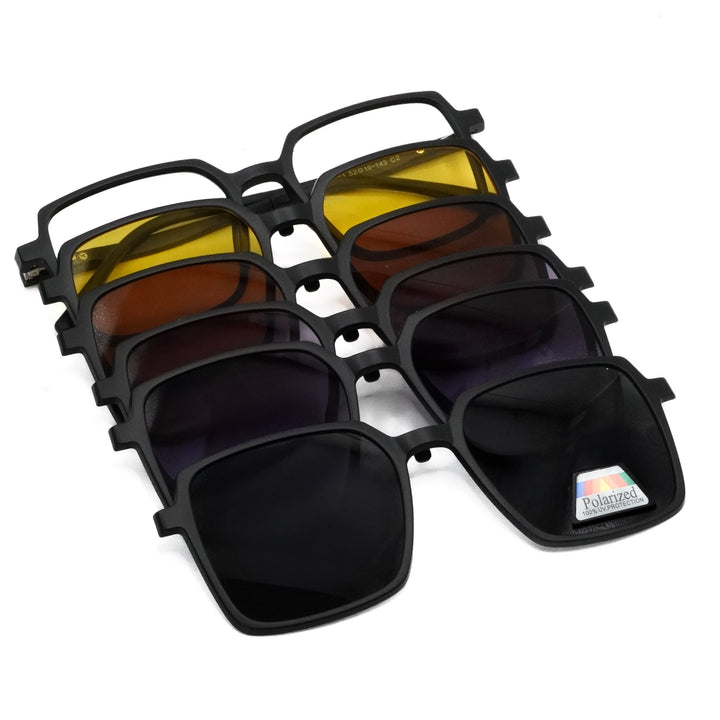 Armazón cuadrado negro mate con 5 clips magnéticos intercambiables. Máxima versatilidad y estilo en un solo modelo.
