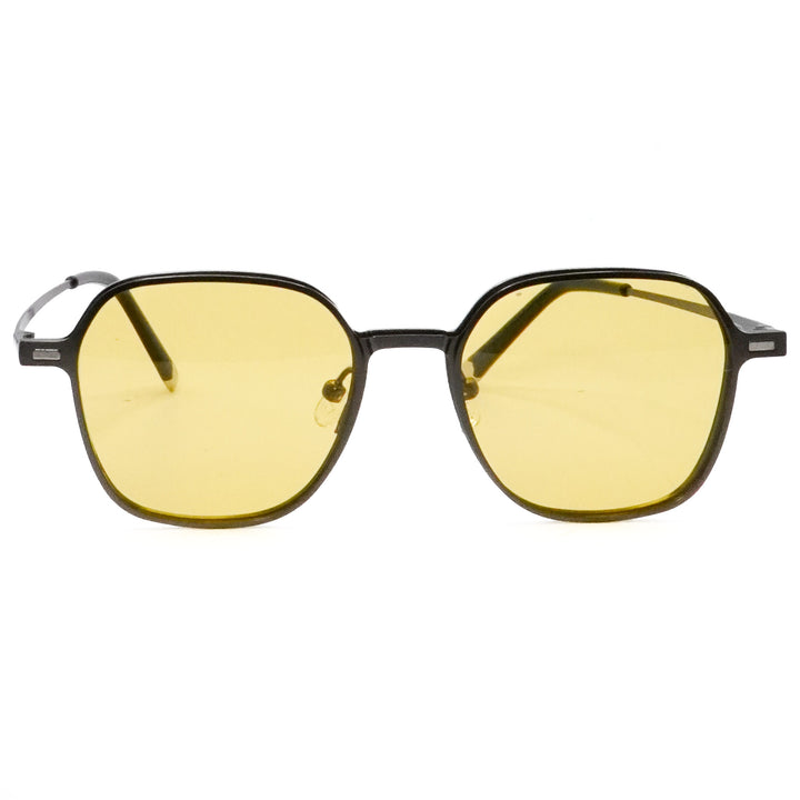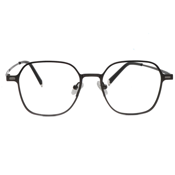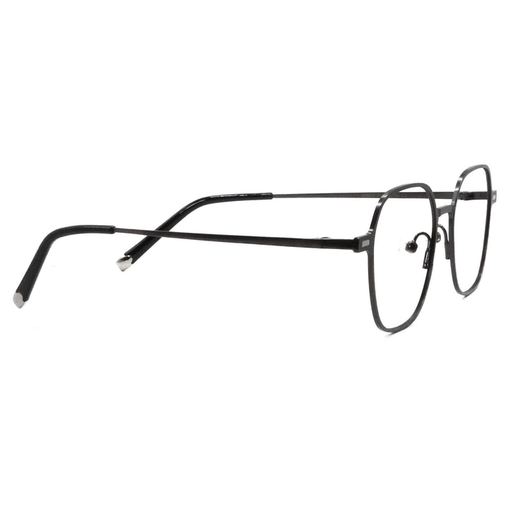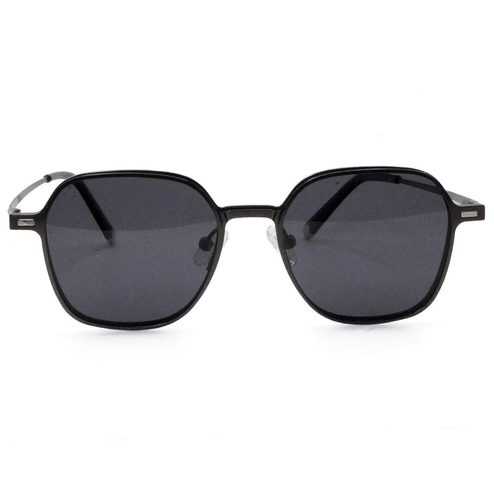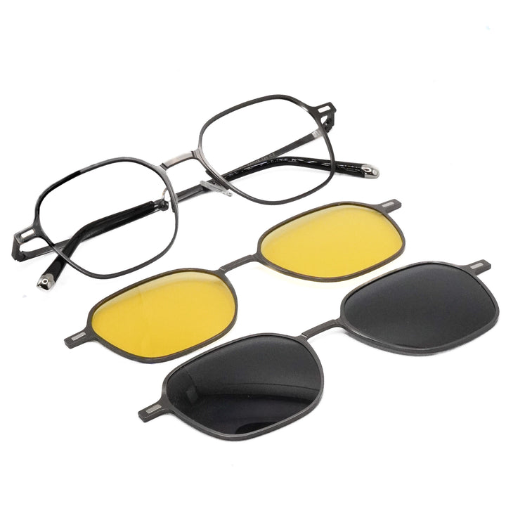 Armazón metálico rectangular en gris oscuro con sistema clip-on magnético. Funcional y sobrio, ideal para día y noche.