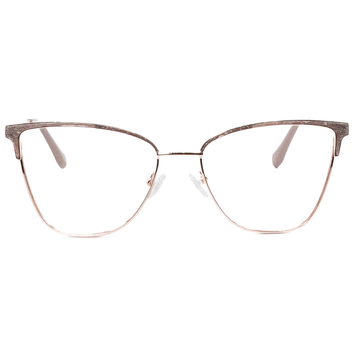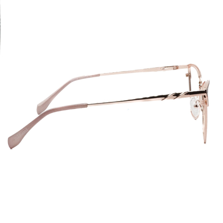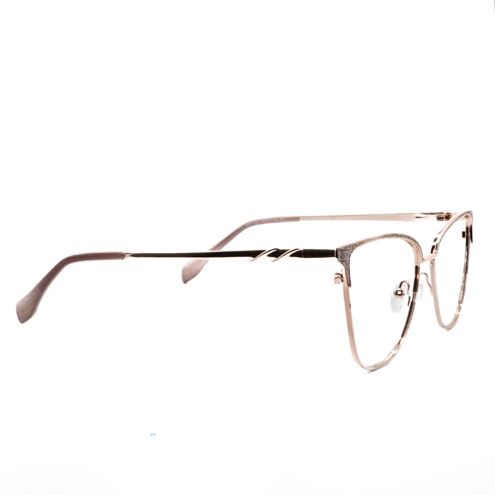 Armazón metálico ligero en oro rosado, con un diseño minimalista que incorpora un delicado detalle en zigzag sobre las varillas. Su estilo fino y elegante lo convierte en una opción sofisticada y versátil.